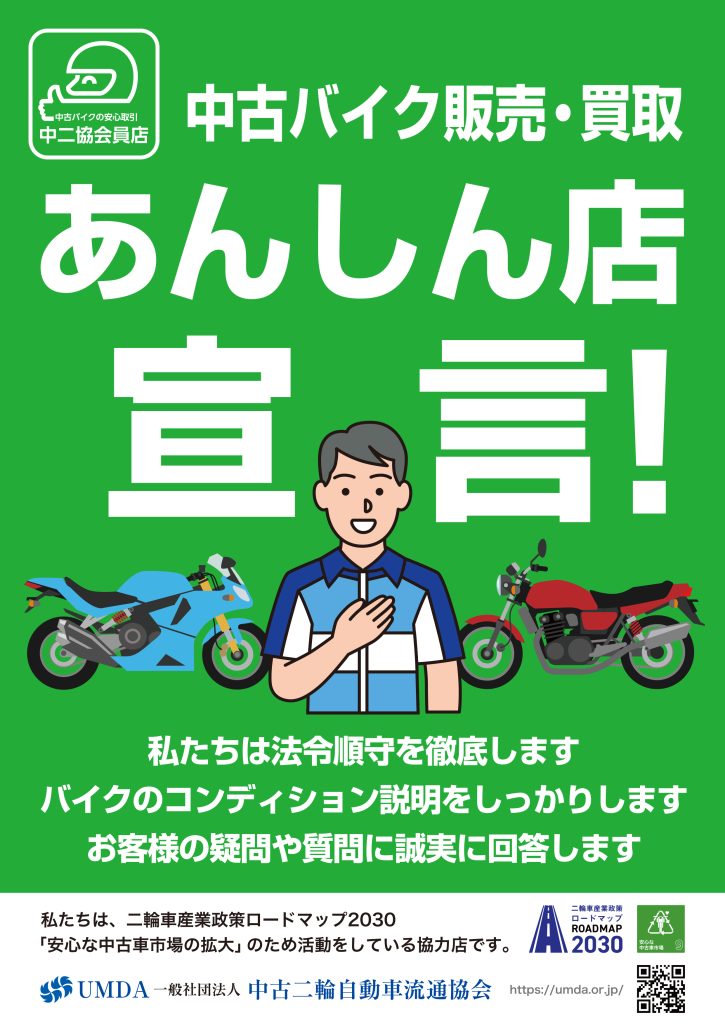 ぜひ、バイクとの新しい出会いや、愛車の売却をご検討の際は、「中古バイク販売・買取 あんしん店宣言!」のロゴが目印の中古二輪自動車流通協会の会員店をご利用ください。