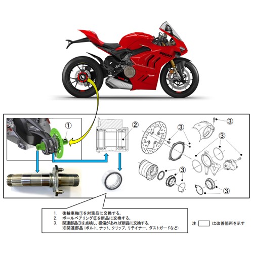 全車両、後輪車軸を対策品に交換し、ホイールベアリングを新品に交換する。なお、後輪車軸の関連部品を点検し、損傷があれば新品に交換する。