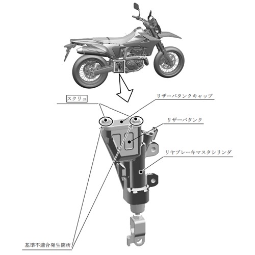 リヤブレーキマスタシリンダのリザーバタンクキャップを固定するスクリュにおいて、締付け作業指示が不適切なため、当該スクリュの締付けトルクが不足しているものがある。そのため、そのままの状態で使用を続けると、当該スクリュが緩んでブレーキ液が漏れ、最悪の場合、リザーバタンク内のブレーキ液が無くなり制動距離が伸びるおそれがある。