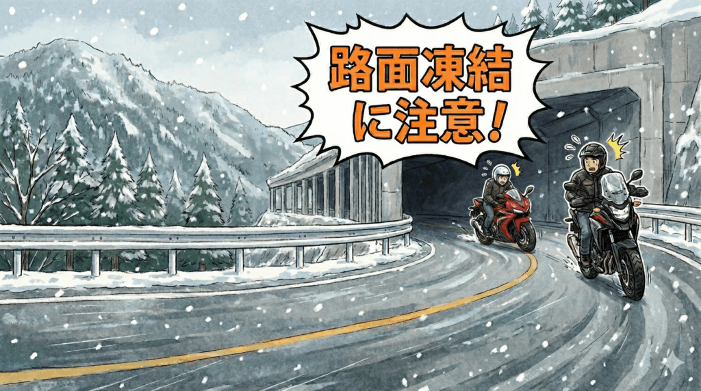 冷え込みの厳しいこの季節、日陰・橋の上・山間部はブラックアイスバーンになりやすく、見た目では分かりにくい場合もあります。